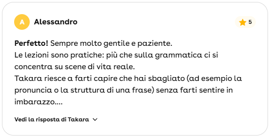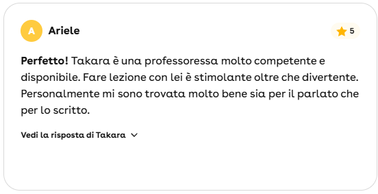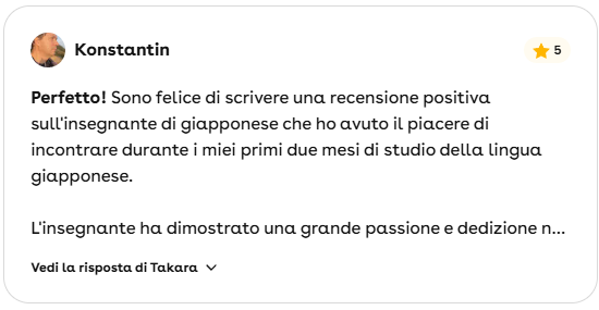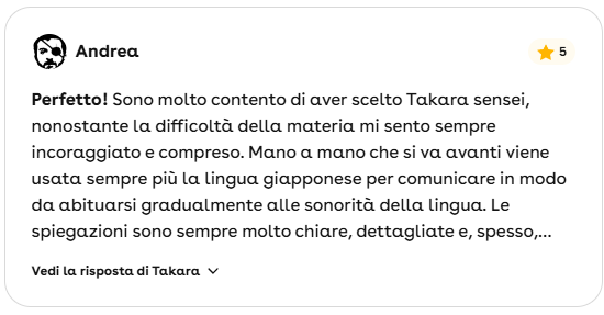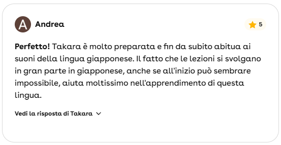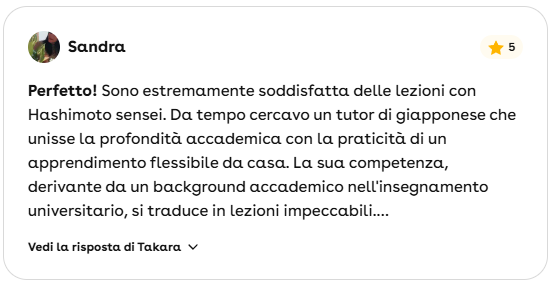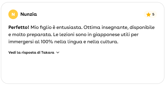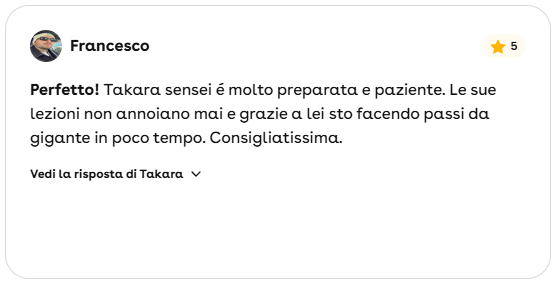 ✅ Sensei madrelingua certificati: docenti madrelingua giapponesi, certificati per l’insegnamento agli stranieri e con anni di esperienza. Questo significa pronuncia autentica, metodo efficace e la sicurezza di imparare la lingua nel modo corretto, con contesto culturale incluso.